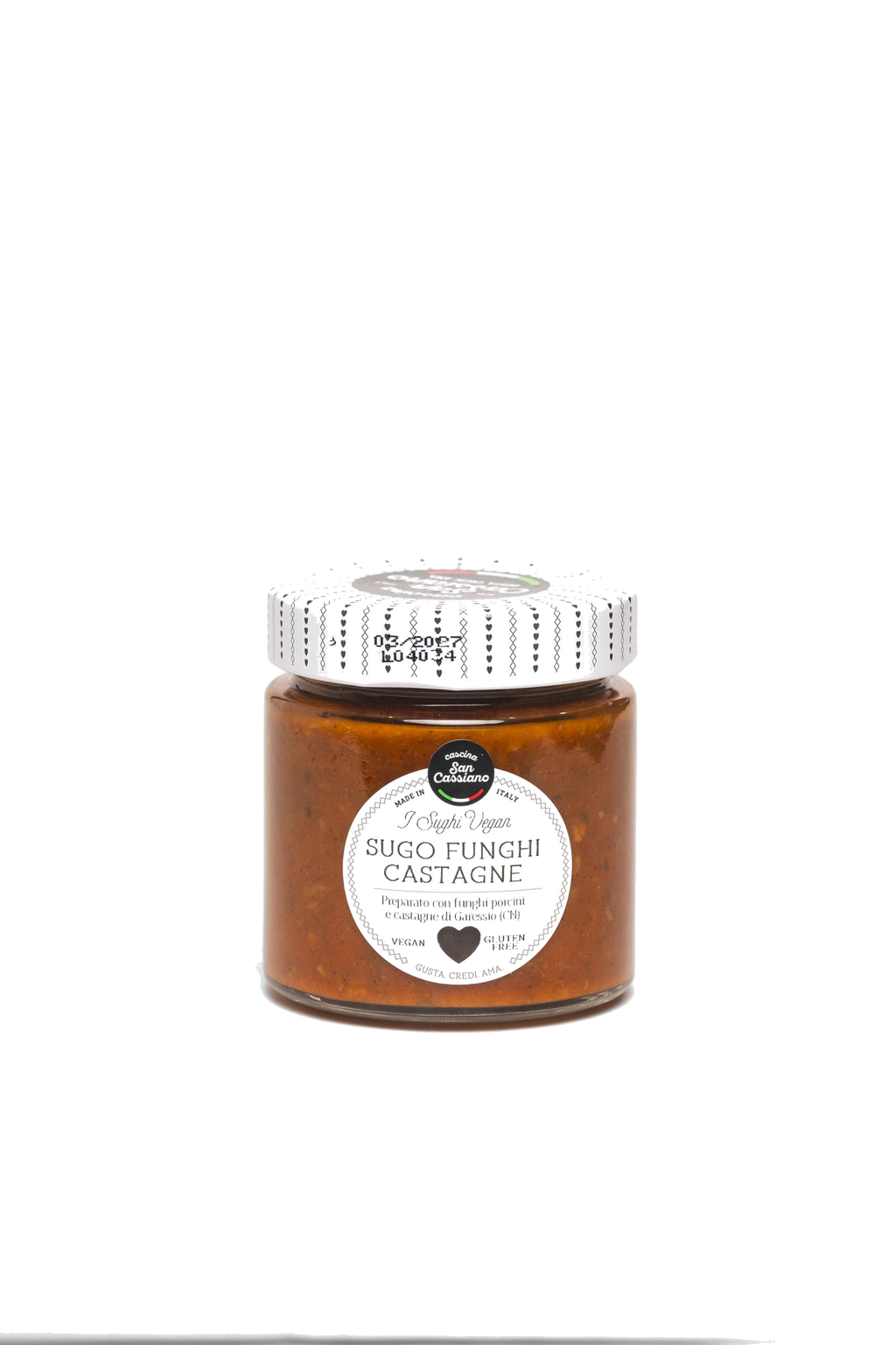 Salsa vegana de setas porcini y castañas de Garessio, combinación otoñal piamontesa. Sabor terroso y dulce natural. Peso neto 190 g. Perfecta con pasta fresca, polenta o como acompañamiento de carnes.
