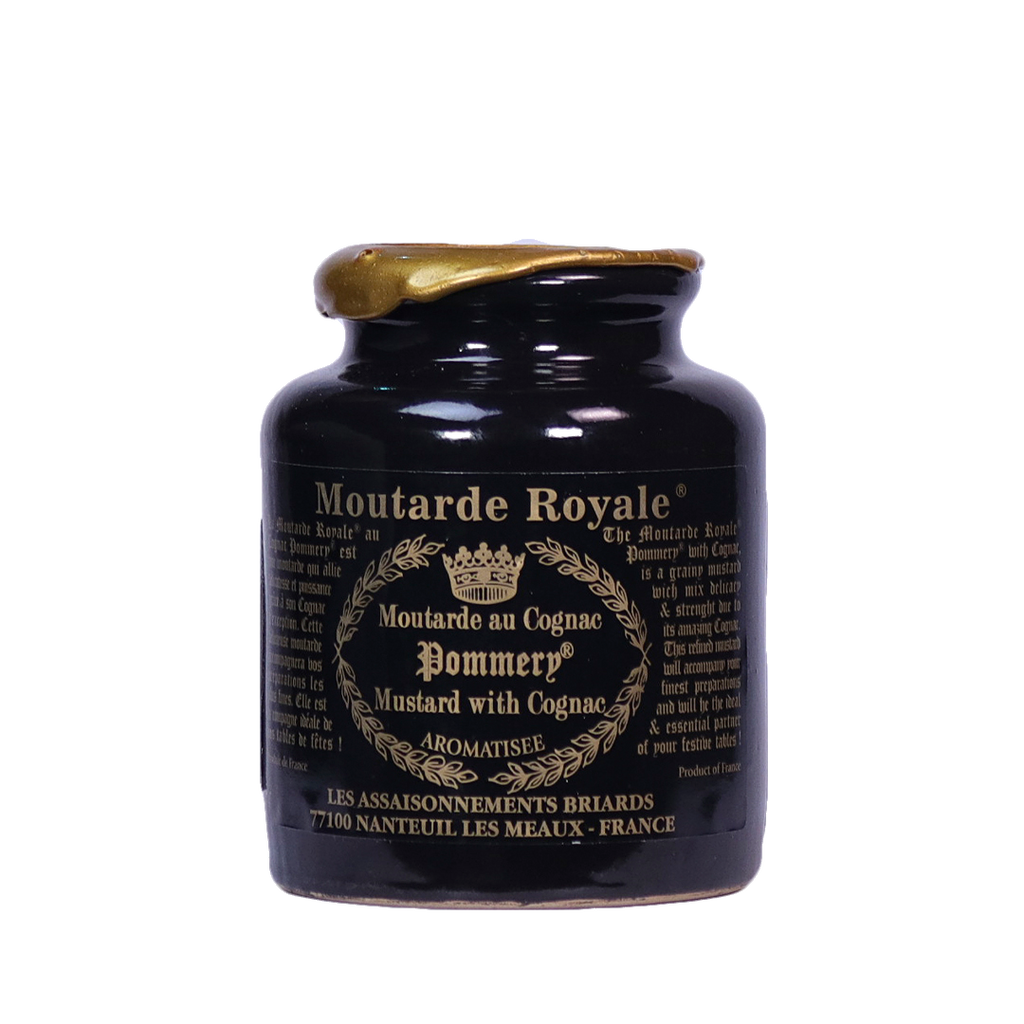 Mostaza royal Pommery con cognac, versión premium con notas espirituosas refinadas. Peso neto 250 g. Sofisticada para carnes nobles, patés y charcutería de alta gama.